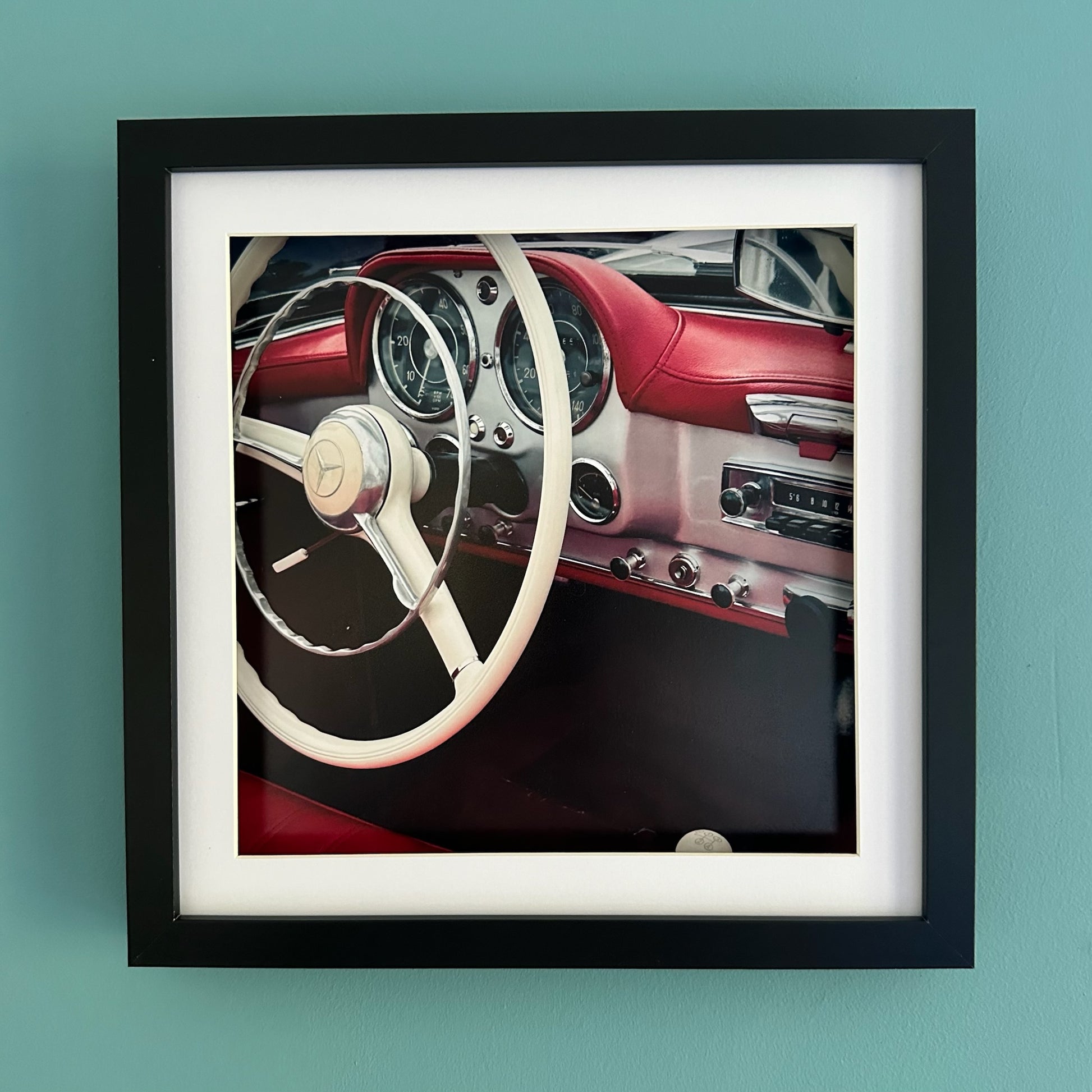 A beautiful Red, Cream and Monochrome high quality classic Mercedes dashboard print, mounted within a stunning black shadow box frame complete with a metal hook on the back of the frame insert for mounting.