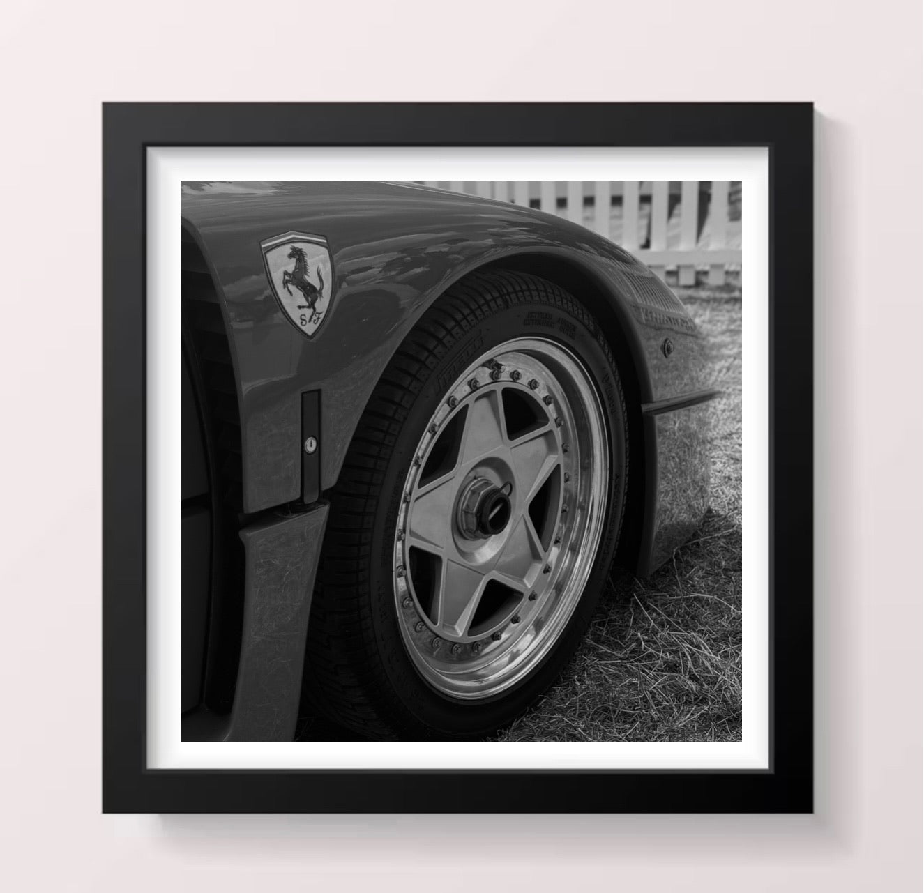 A beautiful high quality monochrome Ferrari front wheel printed picture mounted within a stunning black shadow box frame complete with a metal hook on the back of the frame insert for mounting.